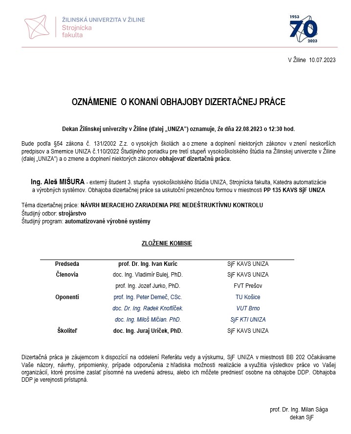 Dovoľujeme si Vám oznámiť, že dňa 22.8.2023 o 12:30 hod v PP134 (KAVS SjF), bude obhajovať svoju dizertačnú prácu Ing. Aleš Mišura.