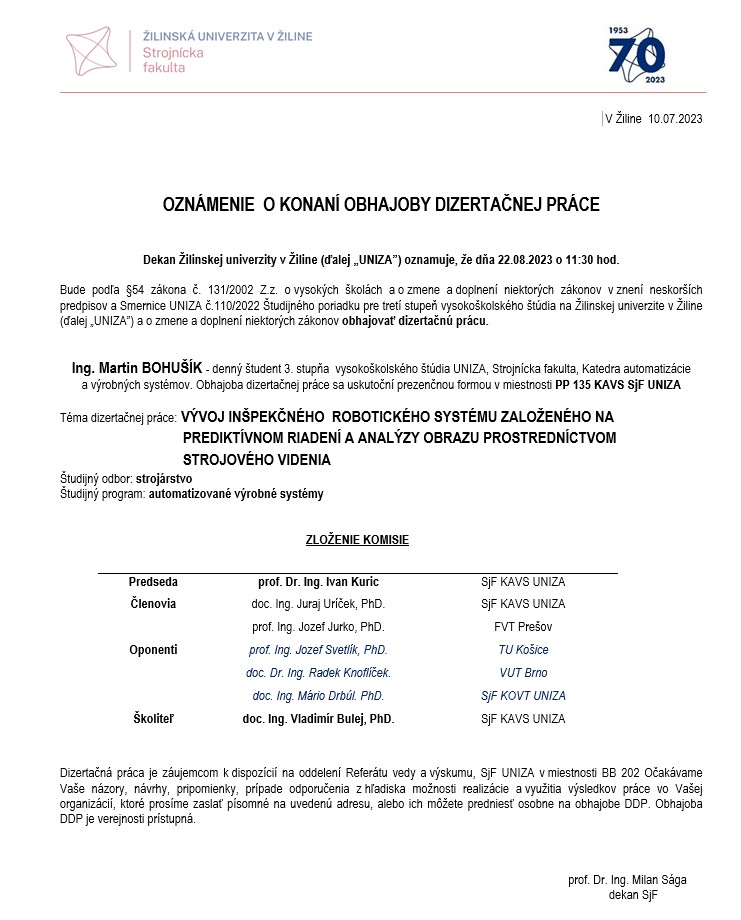 Dovoľujeme si Vám oznámiť, že dňa 22.8.2023 o 11:30 hod v PP134 (KAVS SjF), bude obhajovať svoju dizertačnú prácu Ing. Martin Bohušík.