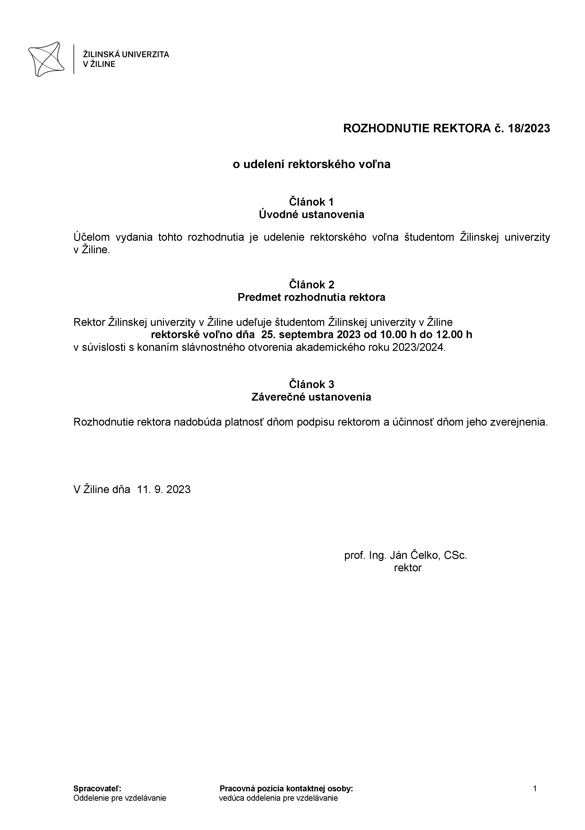 rektorské voľno dňa 25. septembra 2023 od 10.00 h do 12.00 h v súvislosti s konaním slávnostného otvorenia akademického roku 2023/2024.